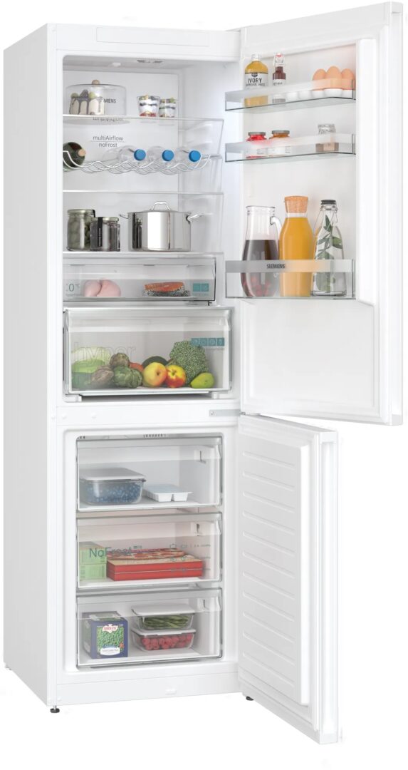 Siemens iQ300 KG36NXWDF. Capacidad neta total: 321 L. Bisagra para puerta: Derecho. Clase climática: SN-T, Nivel de ruido: 35 dB. Frigorífico, capacidad neta: 218 L, Antiescarcha (nevera), Sistema multi-flujo de aire (nevera), Luz interior de la nevera. Congelador, capacidad neta: 103 L, Capacidad de congelación: 9,5 kg/24h, Antiescarcha (congelador). Compartimiento de zona fresca. Clase de eficiencia de energía: D, Consumo de energía anual: 199 kWh. Color del producto: Blanco