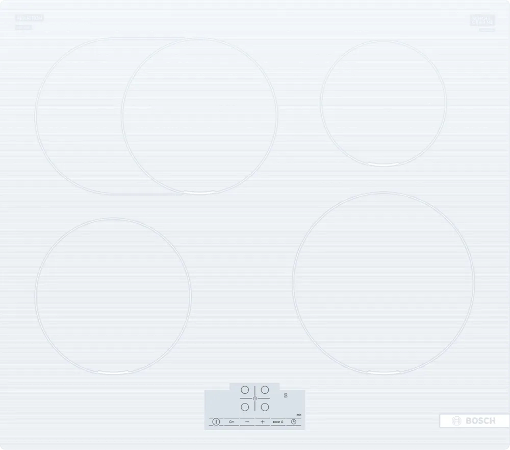 Bosch Serie 6 PIF612BB1E. Color del producto: Blanco, Tipo de instalación: Integrado, Anchura de los quemadores: 60 cm. Tipo de control: Tocar, Control de posición: Frente, Tipo de visualizador: LED. Carga conectada (eléctrica): 7400 W, Voltaje de entrada AC: 220-240 V, Frecuencia de entrada AC: 50-60 Hz. Tecnologías Bosch (cocción): PowerBoost, QuickStart, ReStart, TouchSelect. Ancho: 592 mm, Profundidad: 522 mm, Altura: 51 mm