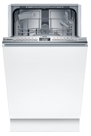 Bosch SPH4EKX17E. Tipo de instalación: Completamente integrado, Talla del producto: Estrecho (45 cm), Panel de control: Acero inoxidable. Número de cubiertos: 10 cubiertos, Clase de emisión de ruido: B, Nivel de ruido: 44 dB. Aplicaciones de control compatibles: Home Connect, Funciones de aplicaciones: Inicio remoto. Clase de eficiencia de energía: B, Consumo de agua por ciclo de lavado: 8,7 L, Consumo de energía por 100 ciclos: 51 kWh. Ancho: 448 mm, Profundidad: 550 mm, Altura: 815 mm