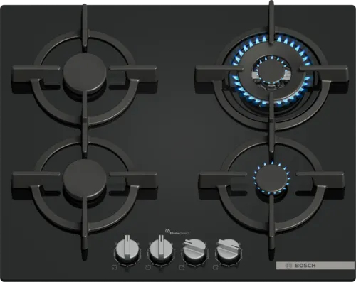 Bosch Serie 6 PPH6A6I10. Color del producto: Negro, Tipo de instalación: Integrado, Anchura de los quemadores: 60 cm. Tipo de control: Giratorio, Control de posición: Frente, Tipo de encendido electrónico: Encendido con una mano. Carga conectada (gas): 8000 W, Voltaje de entrada AC: 220-240 V, Frecuencia de entrada AC: 50 – 60 Hz. Tecnologías Bosch (cocción): FlameSelect®, Wok burner. Ancho: 590 mm, Profundidad: 520 mm, Altura: 54 mm
