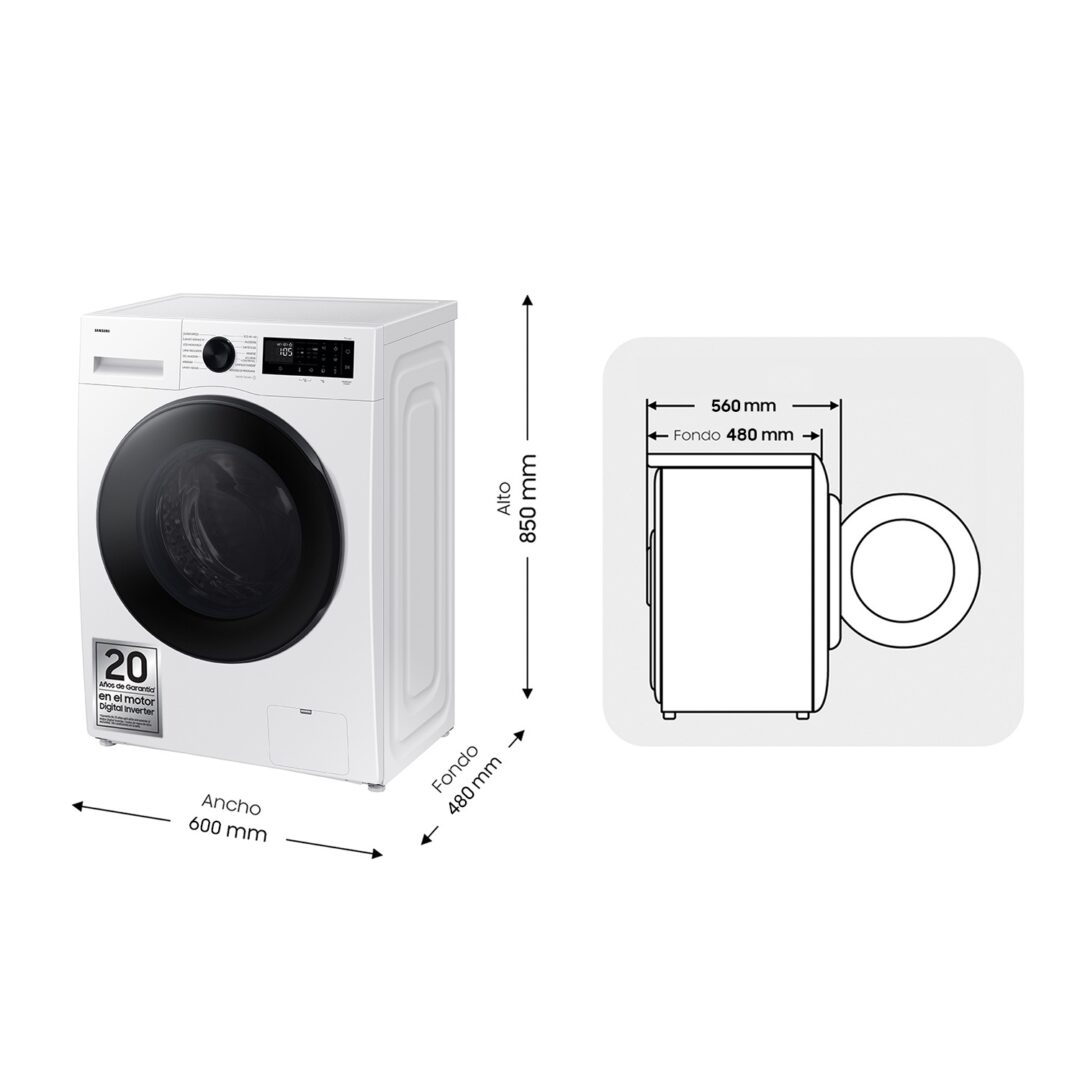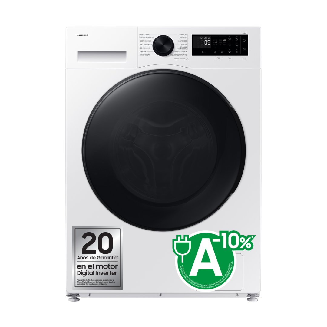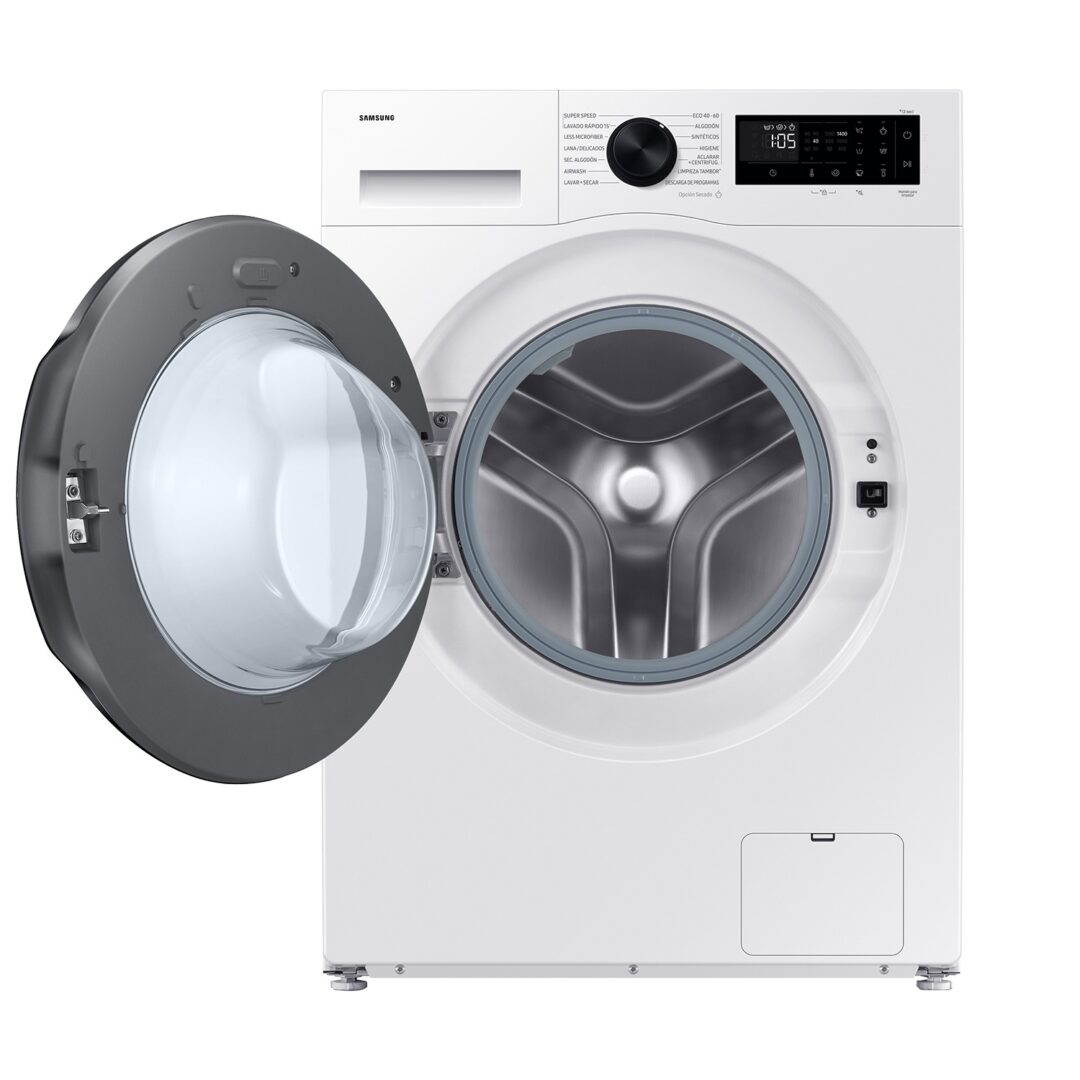Samsung Lavasecadora con fondo reducido 9kg/5kg AI Ecobubble™ Clase E/A-10% Blanca WD90DG5G34BEEC. Tipo de carga: Carga frontal, Tipo de instalación: Independiente, Color del producto: Blanco. Capacidad de nominal (lavado y secado): 5 kg, Máxima velocidad de centrifugado: 1400 RPM, Clase de secado por giro: B. Clase de eficiencia energética (lavado): A, Clase de eficiencia energética (lavado y secado): E, consumo de agua de lavado: 50 L. Tecnologías Samsung (cuidado de la ropa): BubbleSoak™, Drum Clean+, SmartThings. Profundidad: 480 mm, Ancho: 600 mm, Altura: 850 mm