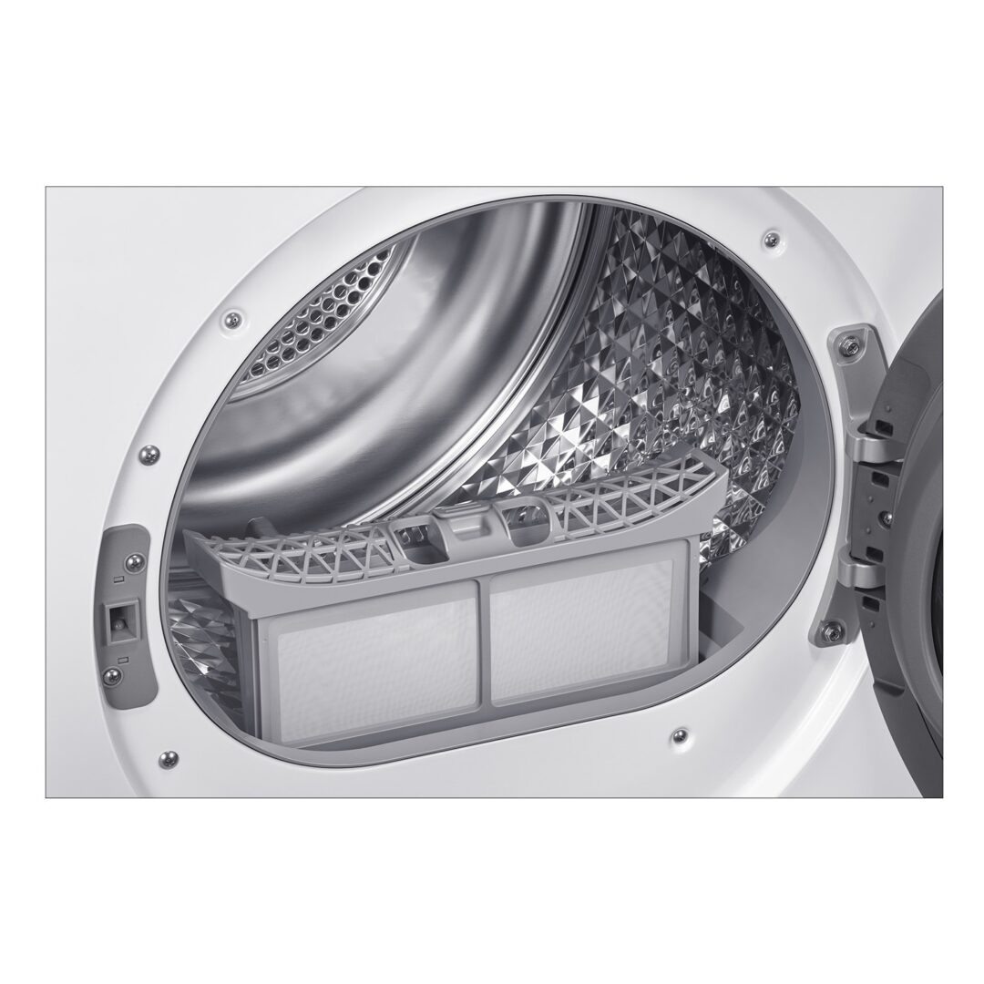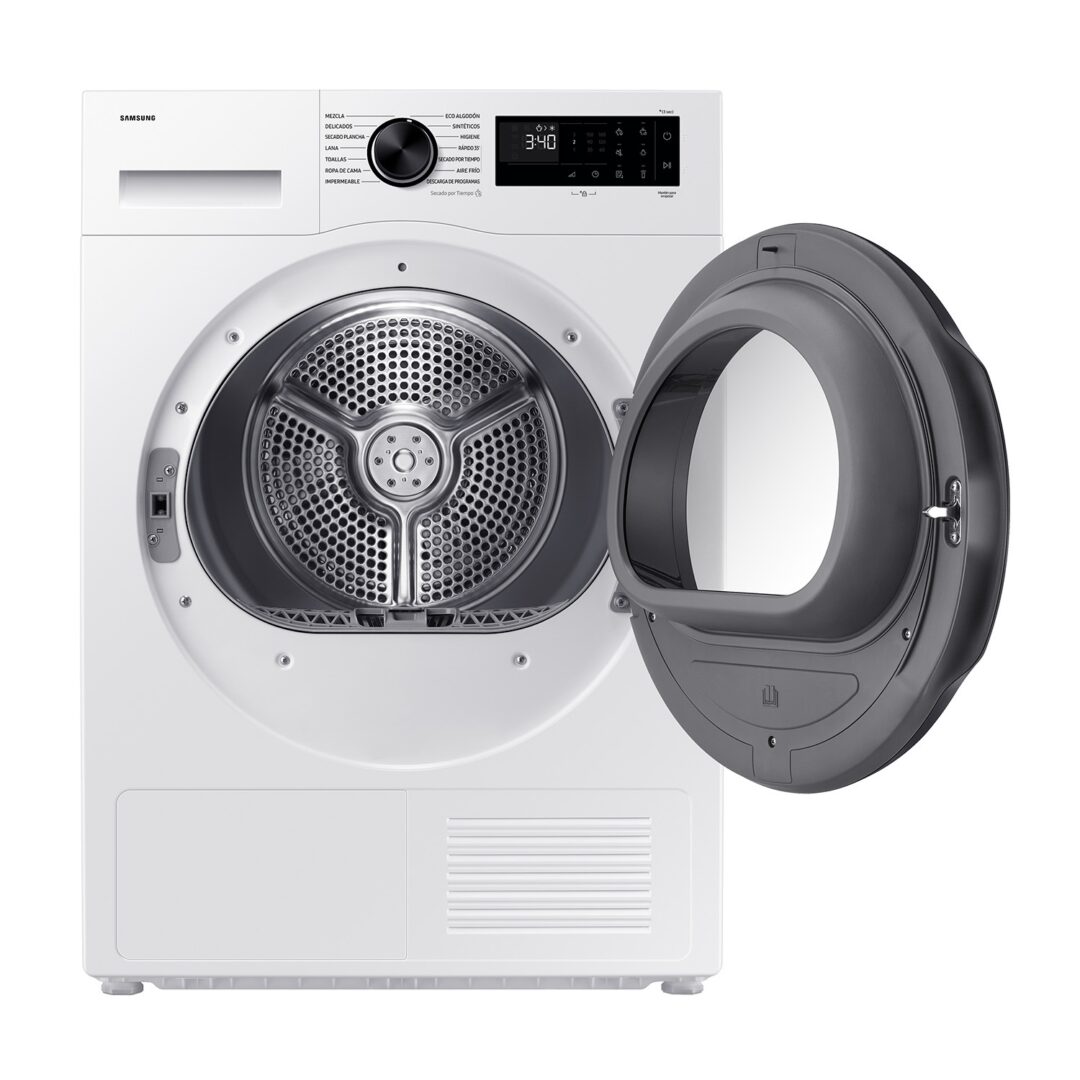 Samsung Secadora 9Kg con Inteligencia Artificial y SmartThings Clase A+++ Blanca DV90DG52A0AEEC. Tipo de instalación: Independiente, Tipo de carga: Carga frontal, Sistema de secado: Bomba de calor. Capacidad nominal: 9 kg, Condensation efficiency class (old): B, Programas de secado: Ropa de cama, Algodón, Cotton eco, Delicado/seda, Cuidado fácil, Intensivo/exteriores, Secado de…. Consumo de energía: 1,54 kWh, Consumo de energía anual: 194 kWh, Fuente de calor: Eléctrico. Tecnologías Samsung (cuidado de la ropa): Motor Digital Inverter, Hygiene Care, OptimalDry™, SmartThings. Profundidad: 600 mm, Ancho: 600 mm, Altura: 850 mm